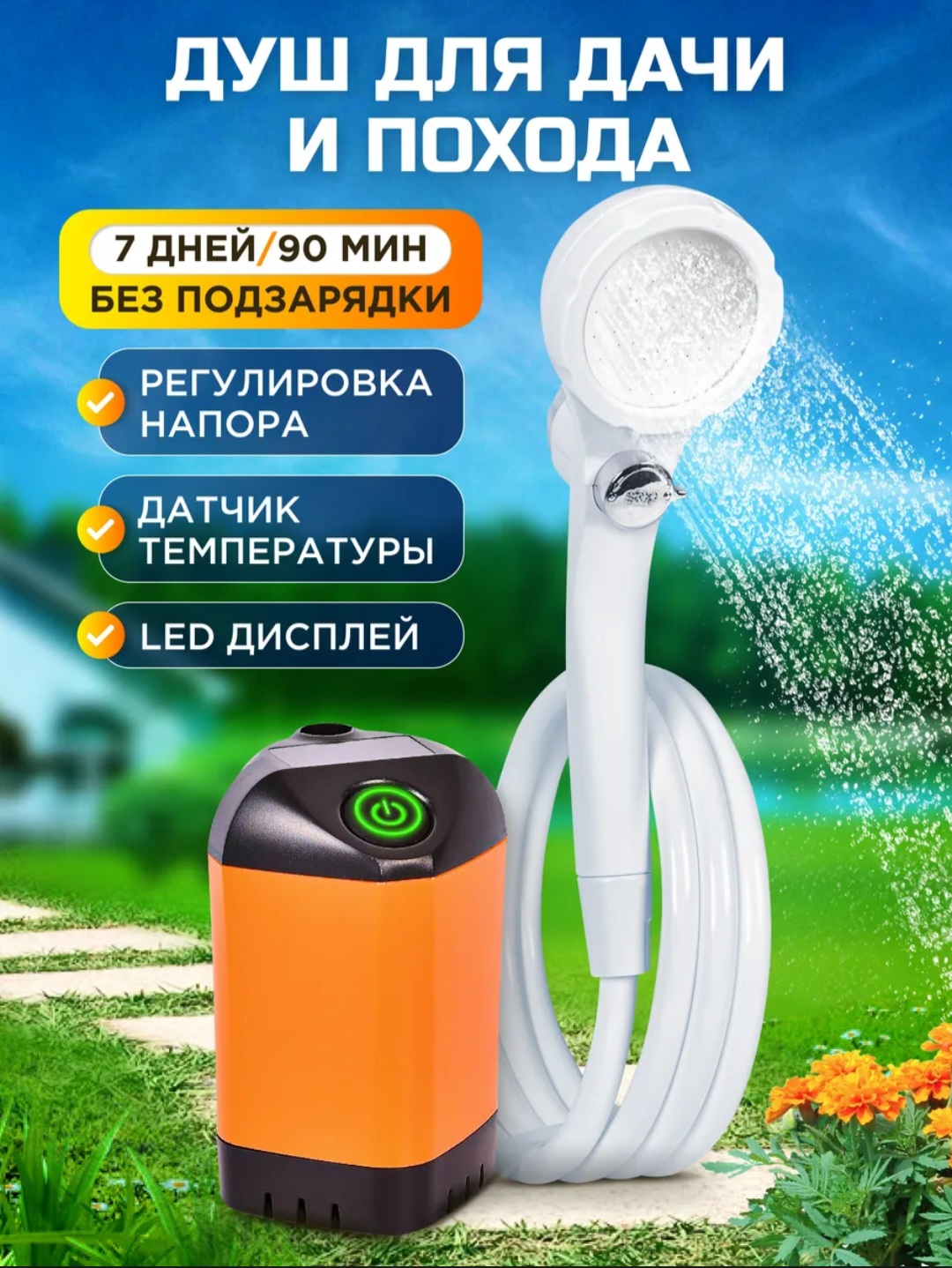 Душ походный аккумуляторный. В комплекте: насос. душевая лейка, шланг, держатель с набором креплений трех видов, сумочка и инструкция на русском языке. Универсальность использования автономного уличногс душа позволяет применять его летом для дачи и сада, туристами в походе, на кемпинге, пикнике, отдыхе на природе в летний день, для мытья автомобиля, полива садовых цветов и огорода, использовать в кабине походной мобильной бани, как умывальник, для купания домашних питомцев на улице. Встроенный аккумулятор емкостью 7800мАч обеспечивает непрерывную работу туристического дорожного душа в течение 100 минут Дачный мини душ прослужит до 7 дней без подзарядки. Быстро заряжается от любого USВ разъема. Hа USB разъеме - водонепроницаемая заглушка. Легкий и компактный дизайн делает портативный переносной душ идеальным для путешествий и кемпингового туризма. Электрический поливочный мини-душ с аксессуарами уместится в любой багаж и станет незаменимым спутником в дороге и автомобильном путешествии. Мощная лейка с насосом перекачивает воду до 8 л/мин, работает тихо. Качает воду из ведра на уровне 1 см. Интеллектуальный трехцветный индикатор температуры воды всегда держит вас в курсе измерения. Цветовая инликация на кнопке включения показывает уровеньзаряда батареи. Напор воды плавнс регулируется с помощью кнопки, расположенной на душевой лейке. Также есть функция временной остановки подачи воды до ЗО секунд, не прибегая к отключению насоса. Встроенный фильтр многократного использования гарантирует чистоту и удовольствие от принятия душа. Качественный противоударный AВS пластик обеспечивает долгий срок службы, а шланг оптимальной длины 2 метра создает комфорт и свобод движения. Набор предусматривает три варианта крепления держателя для разных условий и ситуаций Не откладывайте свой комфорт на потом! Путешествия v отдых на даче с нашим полевым душем оставят в вашей