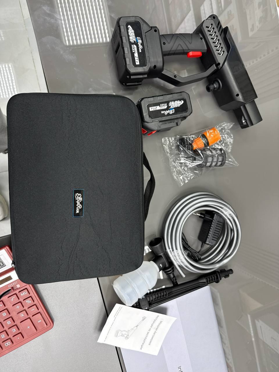 Агрессивный чёрно-красный дизайн в стиле спортивного инструмента с рельефными ребристыми панелями, крупной турбиной на боковой поверхности и красными акцентами — этот насос выглядит как профессиональный инструмент и работает соответственно. Пистолетная рукоятка с красными вставками обеспечивает удобный хват одной рукой — насос держится уверенно и не выскальзывает даже при максимальной мощности потока воздуха. Компактный и лёгкий корпус несмотря на впечатляющую производительность позволяет работать одной рукой без усталости.