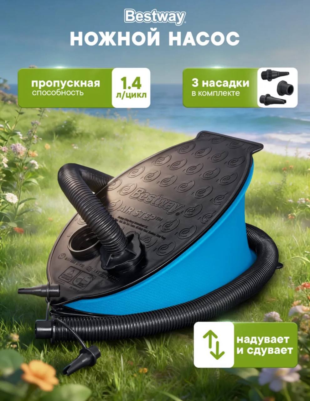 Ножной насос для надувных изделий Bestway, насос для надувного матраса и бассейна ножной, насос для SUP-доски и надувной лодки без электричества, ножной насос с тремя насадками для надувания и сдувания, компактный насос для пляжа и кемпинга, ножной насос 1,4 л за цикл двойного действия, купить ножной насос Bestway Air Step — это быстрое надувание любых надувных изделий без электричества в любом месте и в любое время.