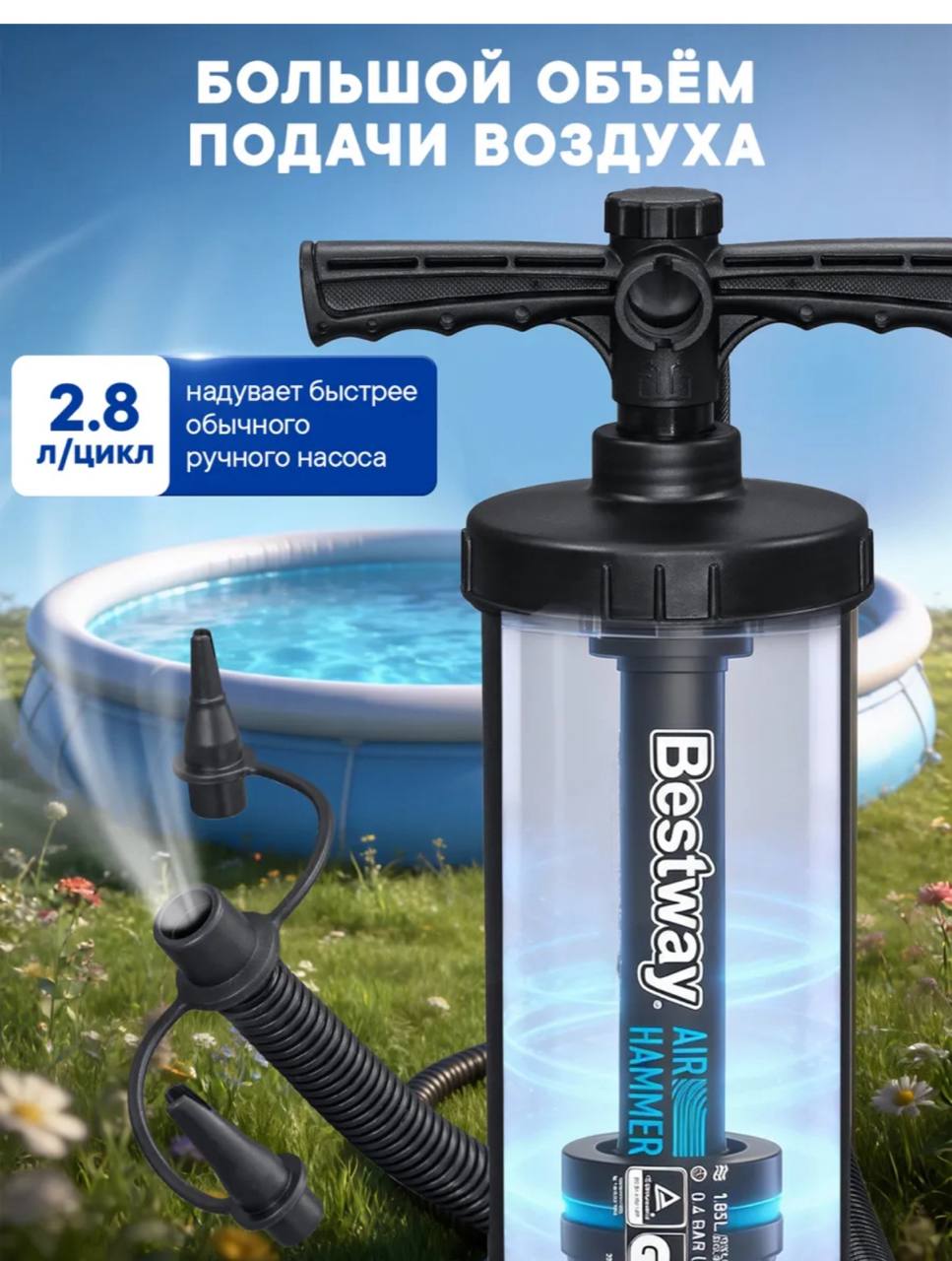 Мощный ручной насос для надувного бассейна 2,8 литра за цикл, насос Bestway Air Hammer для быстрого надувания, поршневой насос большого объёма для матраса и лодки, ручной насос для SUP-доски и надувного бассейна, насос 37 см с гибким шлангом и насадками, быстрый ручной насос без электричества для пляжа и дачи, купить насос Bestway Air Hammer — это максимальная производительность среди ручных насосов для быстрого и лёгкого надувания любых крупных надувных изделий.