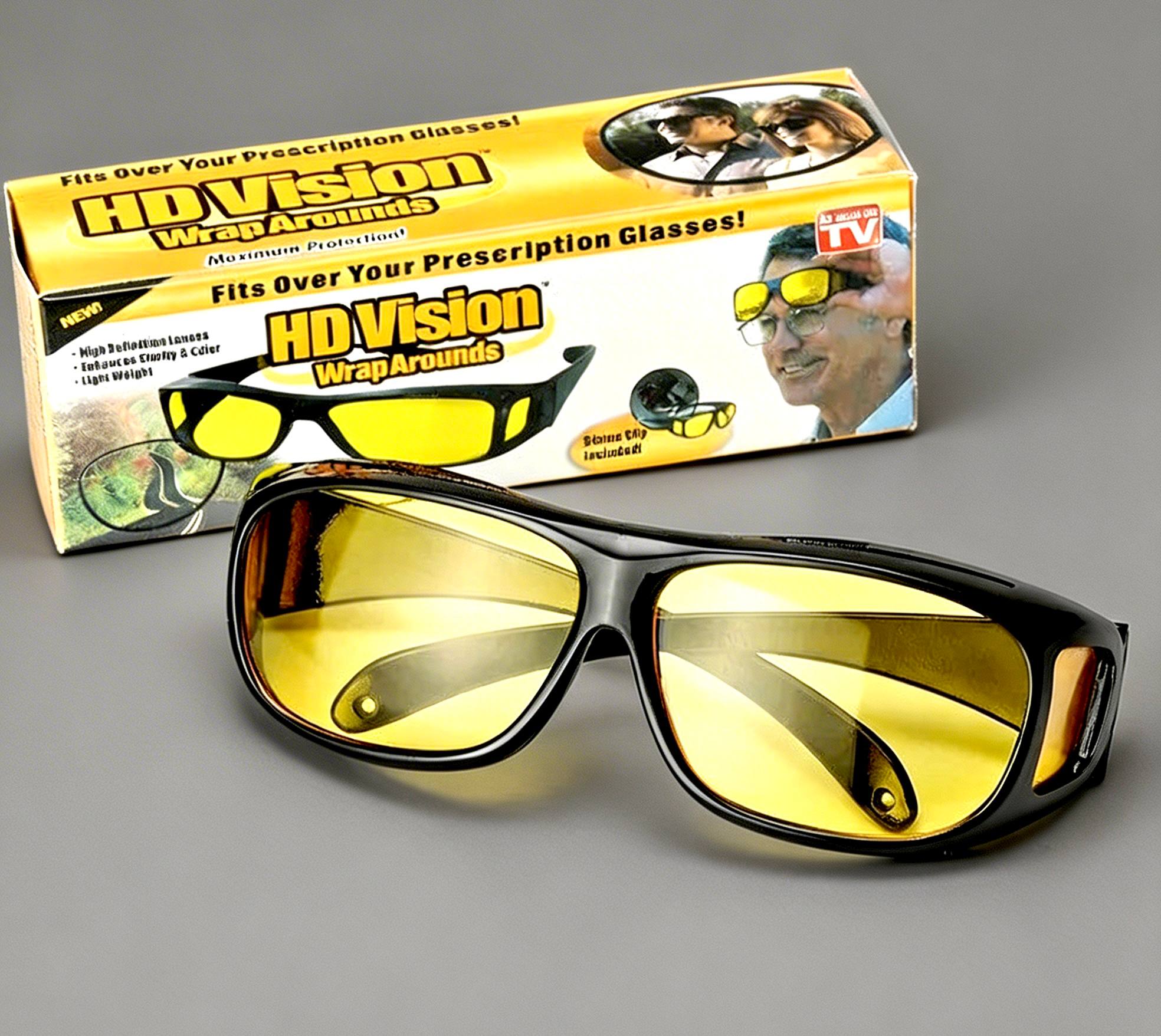 Очки для водителей HD Vision WrapArounds — это антибликовые очки с жёлтыми линзами высокой чёткости High Definition Lenses, которые надеваются поверх обычных корригирующих очков Fits Over Your Prescription Glasses и обеспечивают максимальную защиту и улучшенную видимость при вождении в условиях яркого солнца, тумана, дождя, сумерек и ночного освещения. Enhances Clarity & Color, Light Weight — улучшает чёткость и цветопередачу, при этом лёгкие и комфортные в носке весь день.